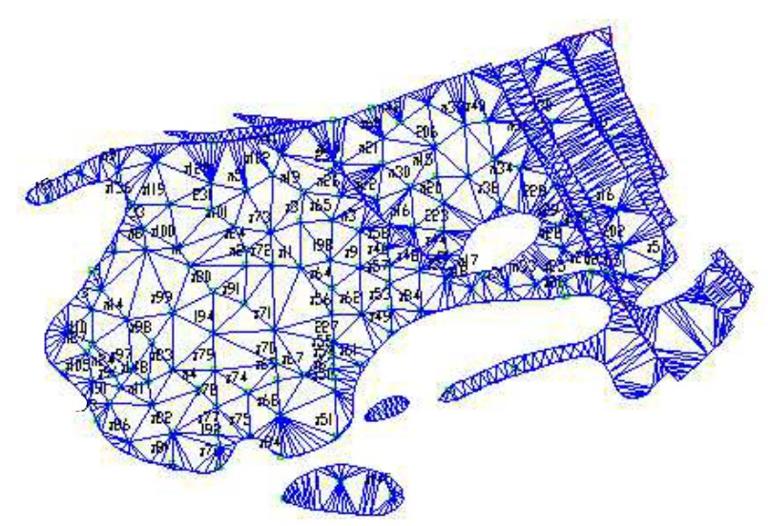 利用Delauney三角剖分准则就可以完成对TIN的自动生成,下图是不规则三角网,单个三角形的顶点就是原始数据点或其他空间信息的控制点。